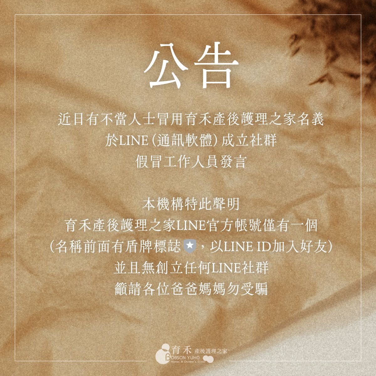 近日有不當人士冒用育禾產後護理之家名義,